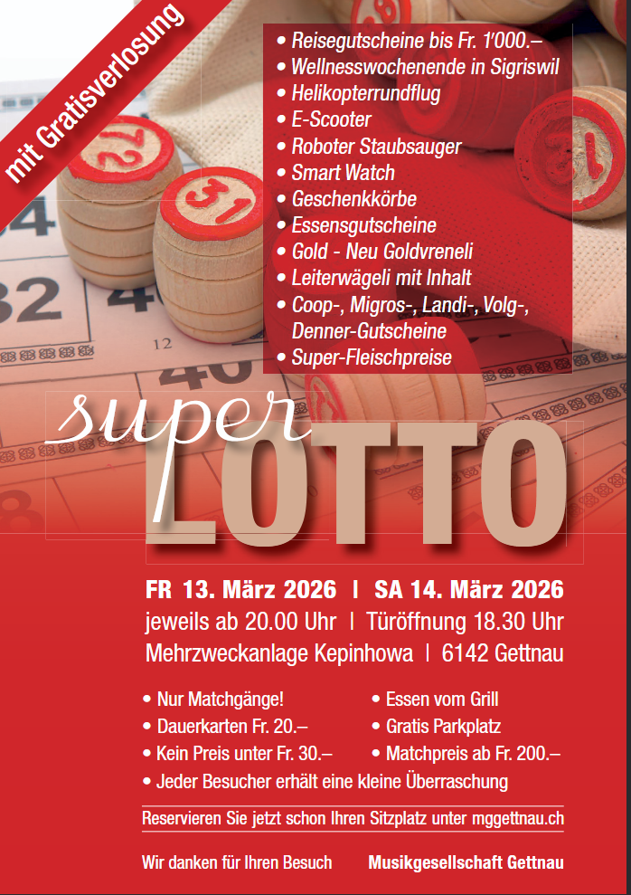 Am 13. und 14. März 2026 finden unsere alljährlichen Lottoabende statt. Alle Infos zum Anlass finden sie auf Lotto.
